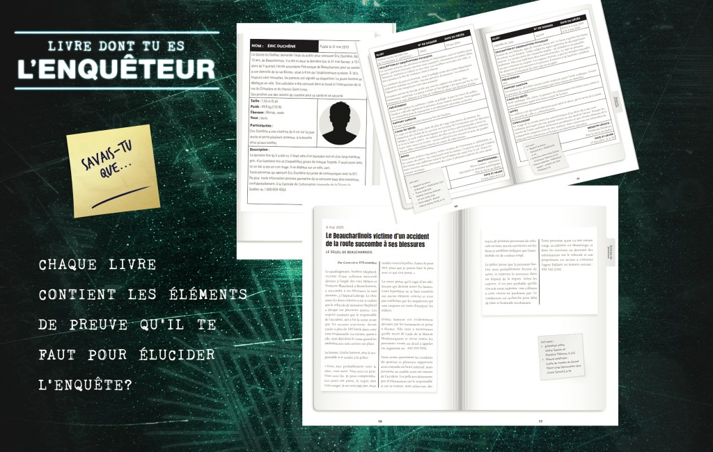 Salut ! Ce livre n’est pas comme les autres. Premièrement, il s’agit d’un dossier d’enquête. Ce n’est pas un roman. Toutes les preuves nécessaires pour résoudre l’enquête sont répertoriées par catégorie. On y retrouve les fiches des disparitions publiées sur le site de la Sûreté du Québec ; les articles de journaux et de blogues; les rapports de police, d’autopsies et venant d’autres professionnels; l’analyse des preuves matérielles et, finalement, les entrevues des témoins.